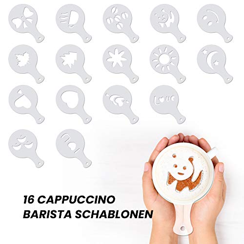 2. Diese Kaffeeform hat 16 verschiedene Muster, einschließlich Weihnachtsbaum, Smiley, Ahornblatt, Sonne, „LIEBE“ -Buchstaben, Herzform, Blumen usw., die Ihren unterschiedlichen Bedürfnissen nach Cappuccino-Blumen gerecht werden können.