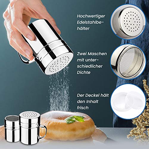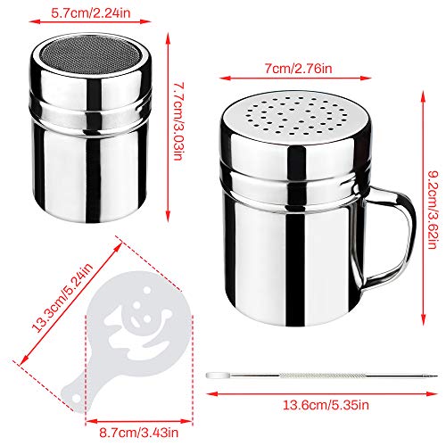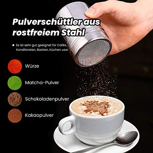 ♡ 【Edelstahl-Schokoladenrührer】 2 verschiedene kleine Öffnungen können für unterschiedliche Pulverdicken verwendet werden. Schütteln Sie beim Backen den Puderzucker auf den Kuchen und schütteln Sie das Kakaopulver auf den Cappuccino, der perfekt für Latte oder Brot adäquat ist. Ideal für Cappuccino mit Kakao und Zimt.