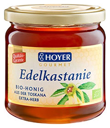 Glutenfrei – Vegan – Bio-Überprüfungsstelle des Herstellers – DE-ÖKO-001 – Fabrikant – HoyerGmbH, D-82398 Polling – Verkehrsbezeichnung – Honig – Zusammenstellung – Edelkastanienhonig jeglicher kontrolliert biologischem Anbau
