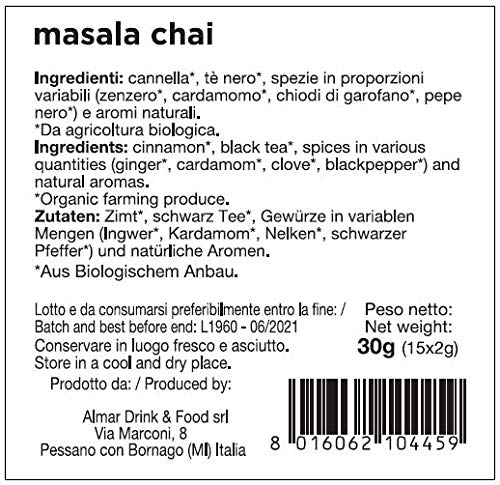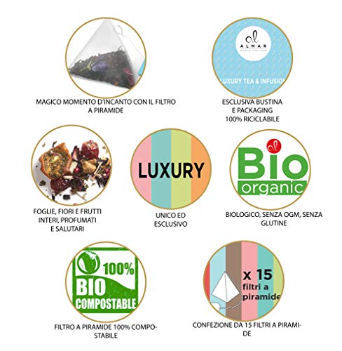 Luxury Tea & Infusion Masala Chai es ist eine einhüllende vielerlei allesamt feinem indischen Schwarztee und seltenen Gewürzen qua Ingwer, Zimt und Nelken. Es hat einen köstlich aromatischen und duftenden Geschmack, Ideal durch der Zugabe von Milch. Der pyramidenfilter ermöglicht es den Teeblättern, sich zu dehydriert und auszudehnen, um jedweder positiven und sensorischen Eigenschaften zum Zeitpunkt der Infusion freizusetzen. Die Transparenz des Filters ermöglicht es, einen magischen Moment der Verzauberung unterdessen der Infusion zu genießen.