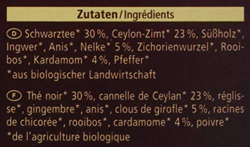 Schwarztee 30%, Ceylon-Zimt 23%, Süßholz, Ingwer, Anis, Nelke 5%, Zichorienwurzel, Rooibos, Kardamom 4%, Pfeffer (leer biologischer Landbau).