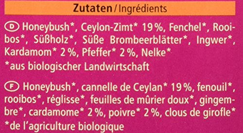 Honeybush, Ceylon-Zimt 19%, Fenchel, Rooibos, Lakritz, Süße Brombeerblätter, Ingwer, Kardamom 2%, Pfeffer 2%, Nelke (jeder biologischer Bestellung).