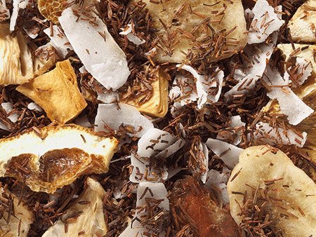 Zutaten: Bananen- und Kokoschips, Rotbuschtee, Mango-, Hawaiananas- und Papayaflocken, Orangenspalten, Aroma.