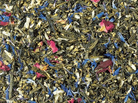 grüner Tee (56%), grüner Mate-Tee, Kokosraspeln, Aroma, Rosenblüten, blaue Kornblumenblüten