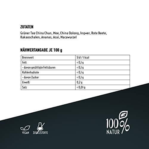 SPORTLICHE ZUTATEN: Stattdessen unsere Athleten handkehrum das Beste! Aber setzen unsere Ernährungsexperten auf 100% natürliche Zutaten mit sportlichem Fokus. Grüner Tee China Chun, Mee, China Oolong, Ingwer, Rote Beete, Kakaoschalen, Ananas, Acai, Macawurzel.