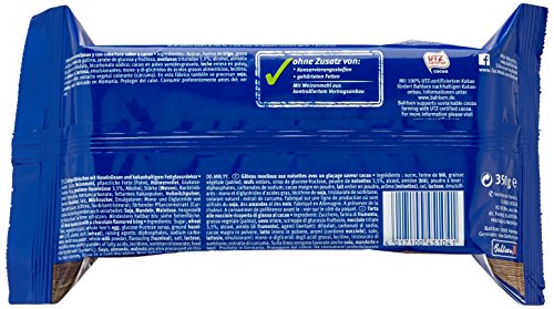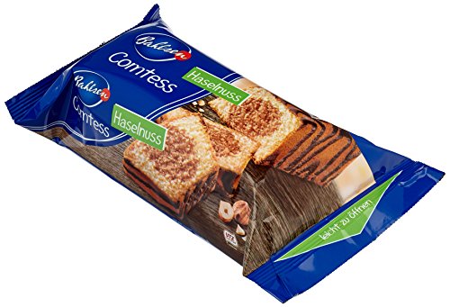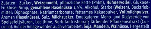 Zutaten : Zucker, WEIZENMEHL, pflanzliche Fette (Palm), HÜHNERVOLLEI, Glukose-Fruktose-Sirup, gemahlene HASELNÜSSE (3,5%), Ethanol, Stärke (WEIZEN), Backtriebmittel: Diphosphate, Natriumcarbonate; fettarmes Kakaopulver, VOLLMILCHPULVER, Aromen (HASELNÜSSE), Salz, MILCHZUCKER, Emulgatoren: Mono- auch Diglyceride von Speisefettsäuren, Lecithine, Sorbitantristearat; färbender Pflanzenextrakt (Curcuma).