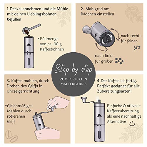 ☕HOCHWERTIGE VERARBEITUNG – Die Mühle besteht aus 304 Edelstahl und ist somit rostfrei und lebensmittelfreundlich. Der abnehmbare, verschraubte Henkel und der Bajonettverschluss verhindern ein Abschrutschen, wie bei herkömmlichen Coffee Grinder.