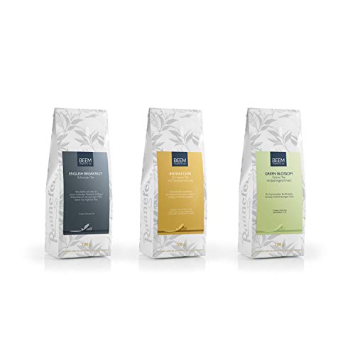 CLASSIC TEA | TEE GESCHENKSET: 1 x INDIAN CHAI Schwarzer Tee – 100 g, 1 x ENGLISH BREAKFAST Schwarzer Tee – 100 g, 1x GREEN BLOSSOM Grüner Tee – 100 g – 3 würzige Tee Klassiker statt das ganze Anno in einem Probierset