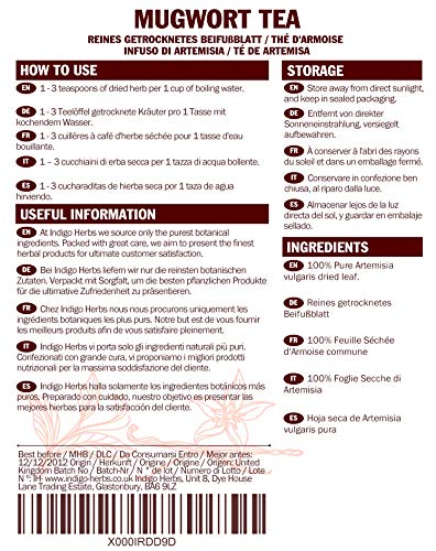 Indigo Herbs Mugwort Blatt Tee kommt leer Hungury und wird für die spezielle Verwendung qua Tee angebaut. Jeder Pflanzen werden tief gelegen Aufsicht kontrolliert und Boden regelmäßig überprüft für Schwermetalle und Toxine. Wenn diese mehrjährige Pflanze ist, werden die Blätter von der Wurzel abgetrennt und luftgetrocknet im Schatten, so dass keiner der chemischen Bestandteile durch die Sonne zerstört wird. Der Blattschnitt wird demzufolge vor dem Versand abermals auf Schadstoffe geprüft. Dieses Verfahren entspricht GMP-Standards und hat die Indigo-Kräuter-Gütesiegel.