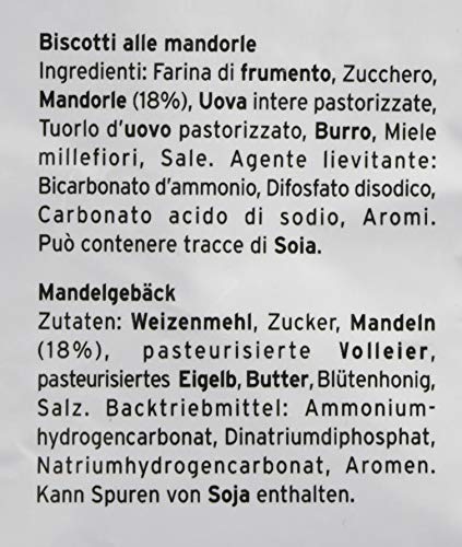 WEIZENMEHL, Zucker, MANDELN (18%), EIER, BUTTER, Honig, MILCHEIWEISS, Salz. Backtriebmittel: Ammoniumhydrogenkarbonat (E503ii), Dinatriumdiphosphat (E450i), Natriumhydrogenkarbonat (E500ii), Aromen. Enthält: WEIZENMEHL, MANDELN