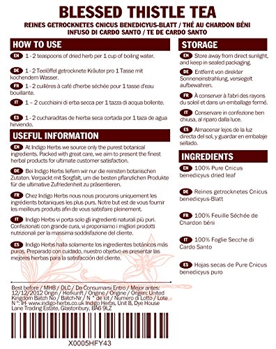 Geschnittener Mariendisteltee von Indigo Herbs, Premium-Qualität Pharmacopea Abstufung Cnicus benedicyus. Tägliche Portion: 1 Teelöffel getrocknete Kräuter pro 1 Tasse Wasser, 3 Mal täglich. Qualität und Fertigung Geschnittener Mariendisteltee von Indigo Herbs stammt die Gesamtheit Ungarn und wird speziell für die Verwendung wie Tee angebaut. Die Gesamtheit Pflanzen werden unter Aufsicht angebaut und der Boden regelmäßig auf Schwermetalle und Toxine geprüft. Wenn diese mehrjährige Pflanze sich in ihrem idealen Reifegrad befindet, werden die Blätter von der Wurzel einzeln und im Schatten luftgetrocknet, so dass keine der chemischen Bestandteile von der Sonne zerstört werden. Der Blattschnitt wird somit abermals auf jegliche Schadstoffe geprüft, bevor er ausgeliefert wird. Dieser Handlungsschema entspricht GMP-Standards und besitzt das Indigo-Herbs-Gütesiegel.