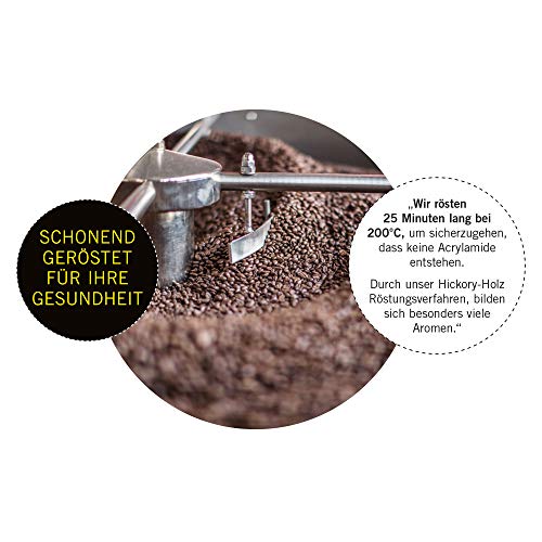 „RÖSTEREI AUS DEUTSCHLAND – Als einzige Rösterei in Deutschland nutzen wirdas Hickory-Holz Verfahren für eine nachhaltige Röstung. Wir versprechen eineRöstung in Kleinchargen ohne Zusatzstoffe“