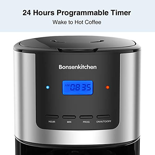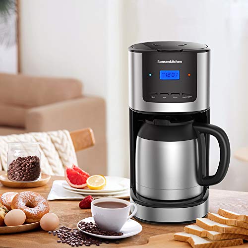 Bonsenkitchen Filterkaffeemaschine, mit Thermoskanne und Timer, 1.5L Programmierbare Edelstahl Kaffeemaschine mit Anti-Drip-Funktion, 10-12 Tassen, LED-Anzeige, Abnehmbarer Filter, CM8003