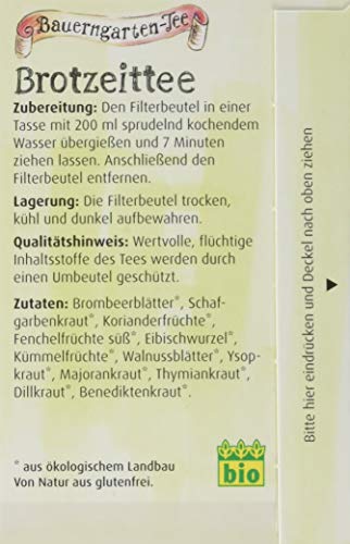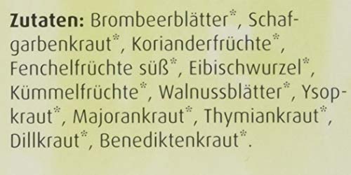 Brombeerblätter*, Schafgarbenkraut*, Korianderfrüchte*, Fenchelfrüchte lustig*, Eibischwurzel*, Kümmelfrüchte*, Walnussblätter*, Ysopkraut*, Majorankraut*, Thymiankraut*, Gurkenkraut*, Benediktenkraut*.*) Ganz ökologischem Agrar