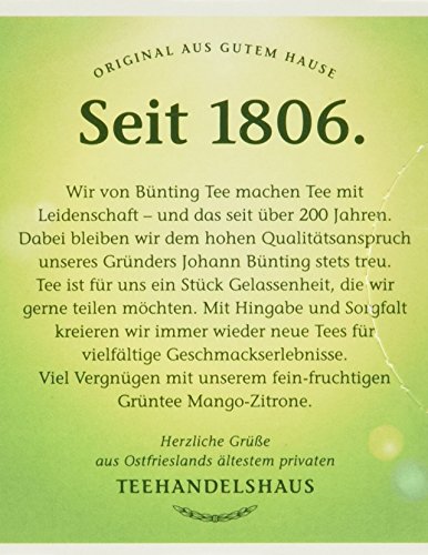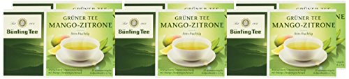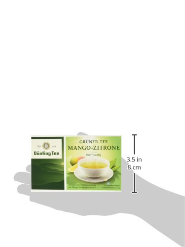 Grüner Tee Mango-Zitrone, fein fruchtig. Aromatisierte Grünteemischung mit Mango-Zitronengeschmack, 20 aromaversiegelte Aufgussbeutel à 1,75g.