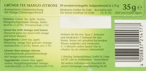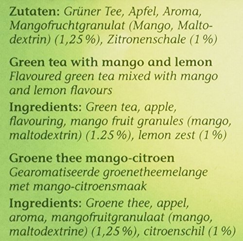 Zutaten: Grüner Tee, Apfel, Aroma, Mangofruchtgranulat (Mango, Maltodextrin) (1,25%), Zitronenschale (1%)