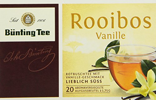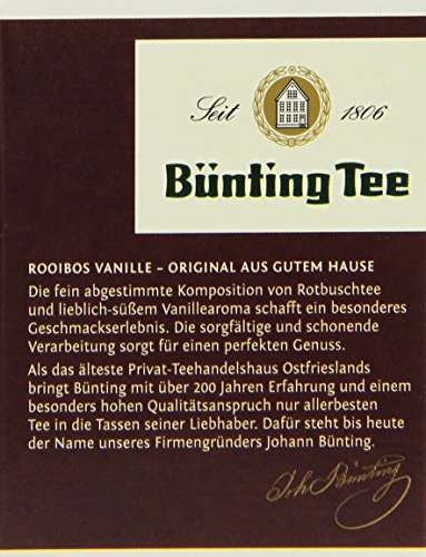 Bünting Tee Rooibos Vanille Rotbuschtee lieblich süss 12er Mob Die fein abgestimmte Komposition die Gesamtheit Rotbuschtee und lieblich-süßem Vanillearoma schafft ein besonderes Geschmackserlebnis. Die sorgfältige und schonende Ausführung sort für einen perfekten Vergnügen. J. Bünting Teehandelshaus GmbH & Comp. Brunnenstraße 37 26789 Nichts sagend/Ostfriesland Zutaten: Rotbuschtee, Aroma.