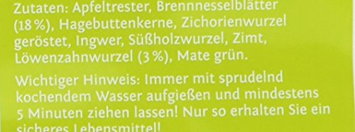 Zutaten: Apfeltrester, Brennnesselblätter (18% ), Hagebuttenkerne, Zichorienwurzel geröstet, Ingwer, Süßholzwurzel, Zimt, Löwenzahnwurzel (3%), Mate grün
