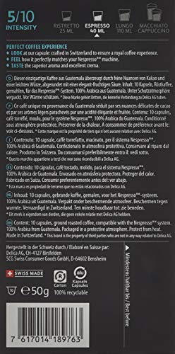 DEIN KAFFEE IM DETAIL: Inhalt: 50 Aluminiumkapseln (5×10 Pack), Röstkaffee, gemahlen – 100% Arabica – Stärkegrad 5 / 10 – Kapseln enthalten 100% UTZ-zertifizierten Kaffee – Espresso (40 ml).