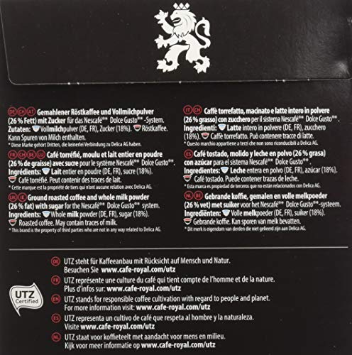 Köstlicher Milchschaum kombiniert mit einem kräftigem Espresso: der Cappuccino. Dieser Kaffee ist UTZ zertifiziert. Wir verwenden lediglich edle Arabica- und Robusta-Bohnen von UTZ-zertifizierten Farmen. Inhalt: 48 Kapseln (3 Packungen mit 16 Kapseln) statt das Nescafé)* Dolce gusto(r)*-system. Amusisch und anliegend Raumtemperatur ablagern. Kompatibilität: Kaffeekapseln qualifiziert mit gängigen Dolce Gusto Kapselmaschinen. Utz Certified. Hergestellt in der Schweiz mit Kaffee und Milch anderer Geburt. Kann Spuren von Milch enthalten. *Diese Marke gehört Dritten, die keinerlei Begründung zur Delica AG haben.