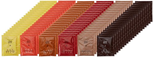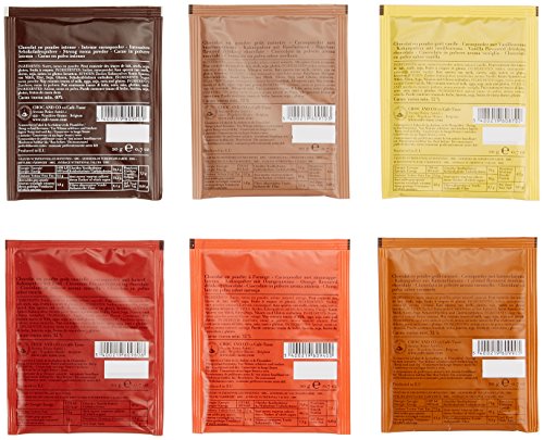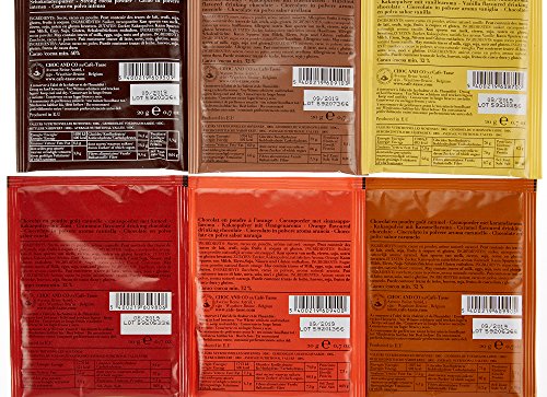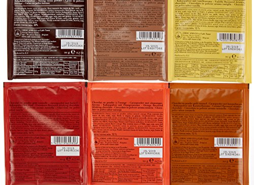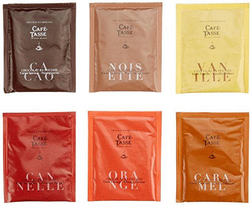 Trinkschokoladen mithilfe sechs verschiedenen Aromen (Zimt, Apfelsine, Vanille, Haselnuss, Karamell, Intense)