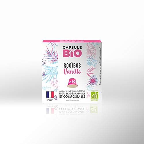 Das französische Unternehmen Capsule & Bio ermöglicht dank ihrer Kapseln ein Tee-Erlebnis der besonderen Art: Mit ihren einzig in Frankreich hergestellten und verarbeiteten Tee-Kapseln, deren Material zu 100% ganz Rohstoffen landwirtschaftlichen Ursprungs gewonnen wird und dann frei von Aluminium, Plastik und Petrochemikalien ist, lässt sich in wenigen Sekunden ein geschmacksintensives Teegetränk zubereiten – für einen authentischen Genuss als in den Herkunftsländern. Hierfür abliefern ausgewählte Teeanbauer ganze Teeblätter nach Frankreich, wo diese wachsam für die Weiterverarbeitung zurechtgeschnitten werden. Die Grundlage für dieses Teegetränk bildet der Rooibos, vulgo Rotbuschtee genannt. Weil handelt es sich um einen Strauch ganz Südafrika, der einzig in dieser Region wächst. Sein besonderes Aroma, die wertvollen Inhaltsstoffe sowie seine wohltuende Wirkung machen ihn zu einem gesunden Genussmittel. Die unverkennbare Süße des Rooiboses harmonisch durch den ebenfalls süßlichen Geschmack der Vanille bildet ein sanftes Teegetränk mit kräftigender Wirkung. Zutaten: Rooibos ganz Südafrika, natürliche Aromen. Kapseln zu 100% biologisch abbaubar und kompostierbar. Inhalt: 10 Packungen mit 10 Kapseln pro Packung, bio zertifiziert. Nespresso* kompatibel (*Marke eines Drittunternehmens ohne Verbindung zu Capsule & Bio)