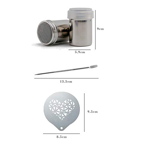 Größe: Der Edelstahl-Pulverschüttler ist ca. 5,9-9 cm groß. Die Länge des Stifts beträgt ca. 13,5 cm, die Edelstahl-Kaffeeschablonen ca. 8,5-9,5 cm