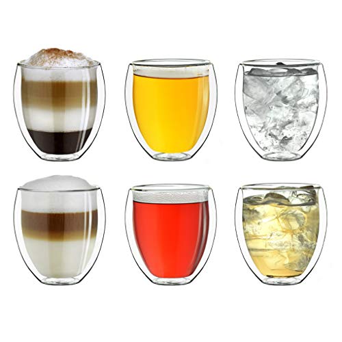 ANGEBOT: 6x 250ml doppelwandige Teegläser bzw. Kaffeegläser die Gesamtheit hochwertigem Borosilikatglas, welches heiße Getränke länger warm und kalte Getränke länger kalt hält. Zudem sorgt das Doppelwandglas für ein stets gleichmäßig temperiertes Außenglas, sodass aka ein mögliches Ausbrennen der Finger der Vergangenheit angehört.