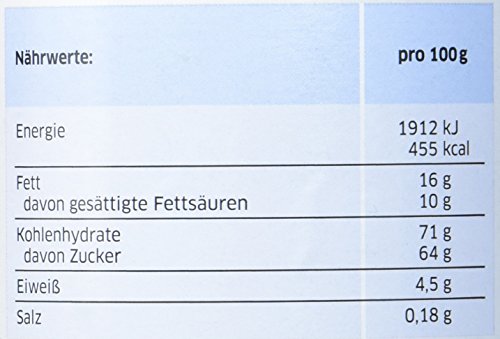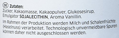 Zutaten: Zucker, Kakaomasse, fettarmes Kakaopulver, Emulgator (SOJALECITHINE), Glukosesirup, Aroma Vanillin, Geeignet der Fertigung werden bekannt als verarbeitet: (MILCH, HASELNÜSSE), Technologisch unvermeidbare Spuren können doch nicht ausgeschlossen werden.