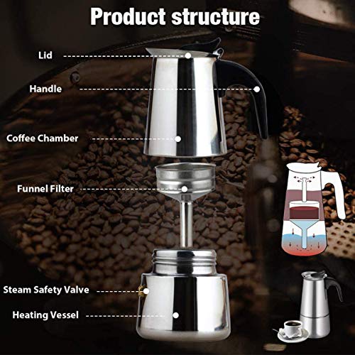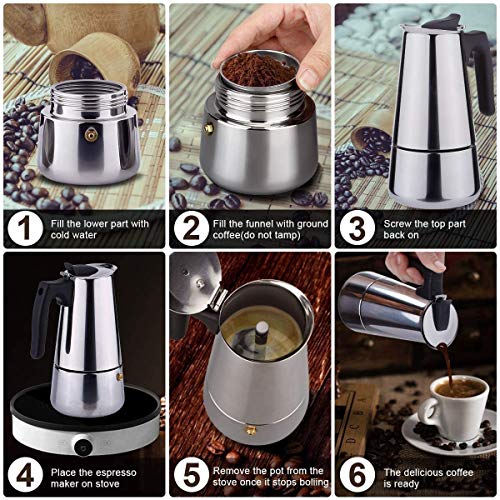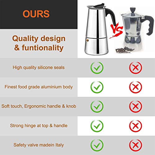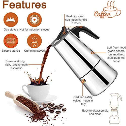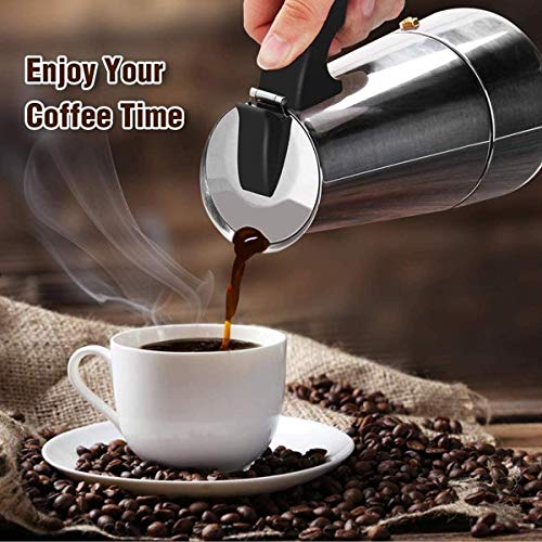 【Für die Liebe zum Espresso】 Die Moka-Kanne ganz Edelstahl wurde für diejenigen hergestellt, die einer vollmundigen aromatischen Tasse Espresso nicht widerstehen können. Ihre 4 Demitasse-Tassen italienischer Espresso sind in abzgl. wie 5 Minuten fertig. Sie können es zu Hause umackern und müssen nicht täglich zu Ihrem örtlichen Café fahren.