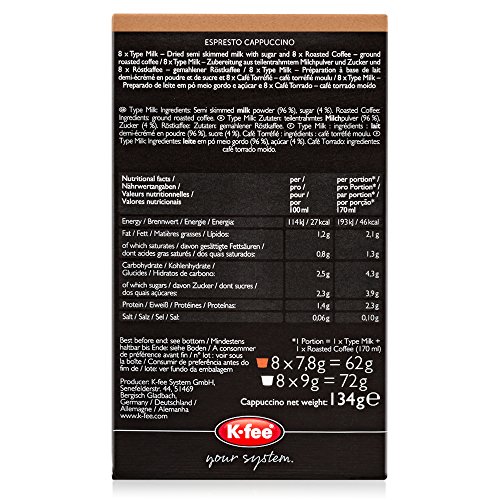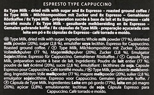Milchkapsel: VollMILCHpulver (77 %), MagerMILCHpulver (20 %), Zucker (2,8 %), Emulgator SOJAlecithin. Kaffeekapsel: gemahlener Röstkaffee.