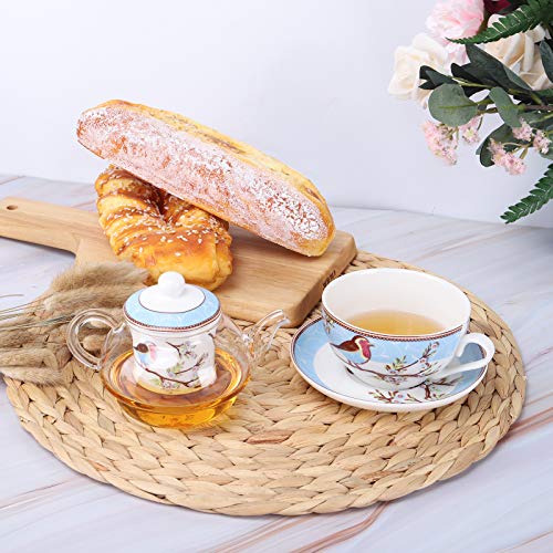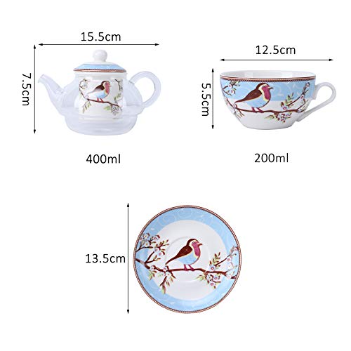 fanquare Blau Robin Vögel und Blumen Tea for One Set, Keramik Teetasse und Untertasse mit Glas Teekanne