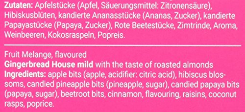 Apfelstücke (Apfel, Säuerungsmittel: Zitronensäure), Hibiskusblüten, kandierte Ananasstücke (Hawaiananas, Zucker), kandierte Papayastücke (Papaya, Zucker), Rote Betestücke, Zimtrinde, Aroma, Weinbeeren, Kokosraspeln, Popreis