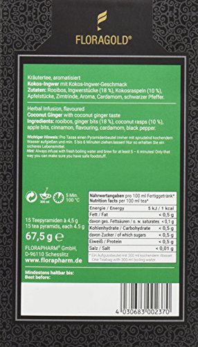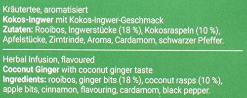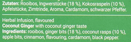 Rooibos, Ingwerstücke(18%), Kokosraspeln(10%), Apfelstücke, Zimtrinde, Aroma, Cardamom, schwarzer Pfeffer