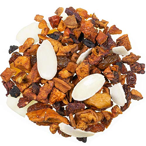 Bestandteile: Apfelstücke (Apfel, Säuerungsmittel: Zitronensäure)(56%),Apfelscheiben (15%), Weinbeeren, Geruch, Zichorienwurzel geröstet, Zimtrinde (4%), Mandelflakes, Vanillestücke (1%)