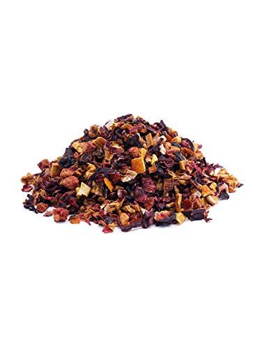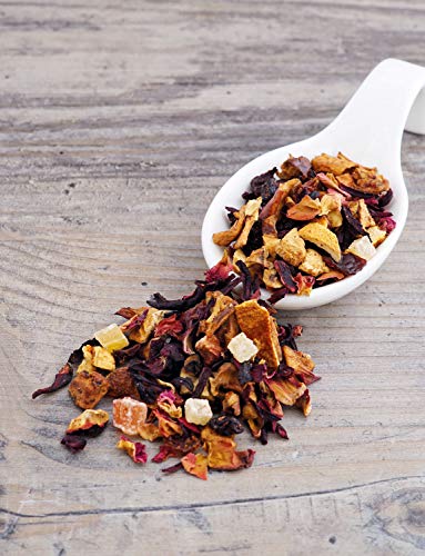 🍵 ZUTATEN: Apfel, Hibiskusblüten, Korinthen, Orangenschalen, Hagebuttenschalen, Rosenblütenblätter, Ananas, Papaya, Erdbeer, Himbeeren.
