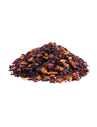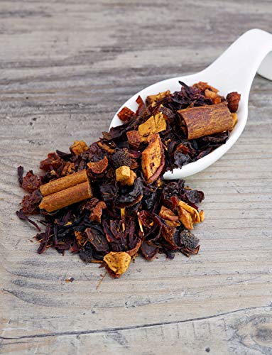 Vollfruchtig würzig. Umschließen sind Hagebuttenschalen, Hibiskusblüten, Apfelstücke, Rotbuschtee, Zimtstangen geschnitten, Würze, MANDELN gehobelt, Zimtstücke.