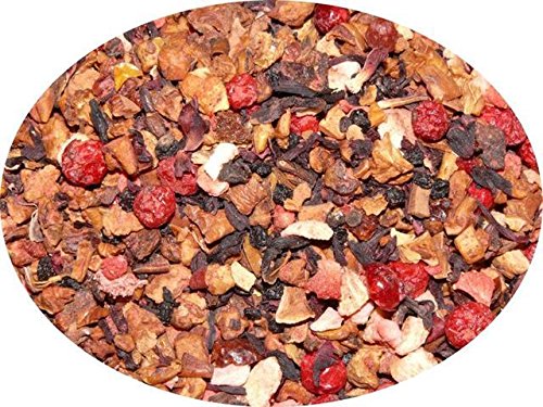 Zutaten: Apfelstücke, Hibiskusblüten, Holunderbeeren, Erdbeerstücke (5%), Hagebuttenschalen, rote Johannisbeeren(2%), Kiwistücke