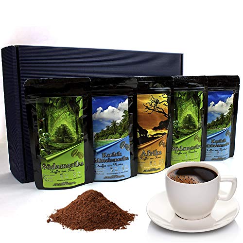 Fünf verschidene Sorten Länderkaffees aufgebraucht Südamerika, Mittelamerika und der Schwarze Kontinent, fünf mal hochwertige Kaffee-Charaktere