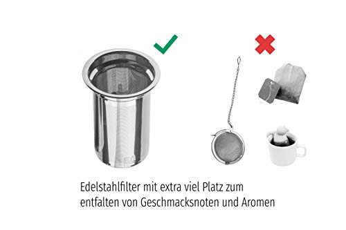 ✅ 𝗧𝗥𝗜𝗡𝗞𝗩𝗘𝗥𝗚𝗡Ü𝗚𝗘𝗡 𝗢𝗛𝗡𝗘 𝗧𝗘𝗘𝗕𝗟𝗔𝗧𝗧 𝗥Ü𝗖𝗞𝗦𝗧Ä𝗡𝗗𝗘 𝗜𝗡 𝗗𝗘𝗥 𝗧𝗔𝗦𝗦𝗘 – Die extrafeinen, durch einen Präzisionslaser gestanzten, Filterlöcher sorgen dafür, dass beim ausschenken keine Teeblätter mit in die Tassen kommen. Der Filter bietet zusätzlich mehr als genug Platz zum vollen Entfalten der Teeblätter, sodass das volle Aroma zur Geltung kommt.