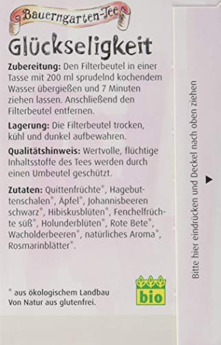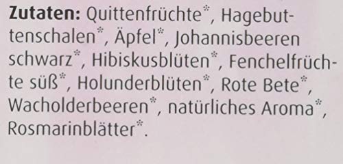 Zutaten:Quittenfrüchte*, Hagebuttenschalen*, Äpfel*, Johannisbeeren schwarz*, Hibiskusblüten*, Fenchelfrüchte süß*, Holunderblüten*, Rote Bete*, Wacholderbeeren*, natürliches Geruch*, Rosmarinblätter*. * jedweder ökologischem Agrar