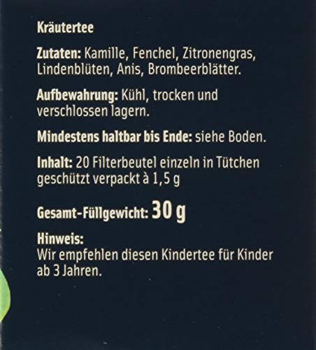 Zutaten: Kamille, Fenchel, Lemongras, Lindenblüte, Anis, süße Brombeerblätter
