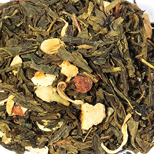 Chinesischer Grüntee Sencha, Quitte, natürliches Aroma, Orangenschale (4%), Orangenstücke (4%), Jasminblüte, Orangenblüte (2%).