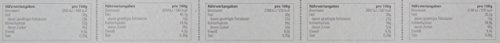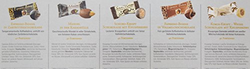 Zutaten: Espresso-Bohne mit Hilfe von Zartbitterschokolade überzogen – Zutaten: Dunkle Schokolade (Kakaomasse, Zucker, Kakaobutter, Emulgator: SOJALECITHIN; natürliches Vanillearoma), geröstete Kaffeebohnen, Kakaobutter, Kakaopulver, Verdickungsmittel: Gummiarabikum; Überzugsmittel: Schellack. Kakao: 56% min. Schokolade: 82% – Mandel mit Hilfe von dunkler Schokolade überzogen, mit Hilfe von Kakaopulver bestäubt – Zutaten: Dunkle Schokolade (Kakaomasse, Zucker, Kakaobutter, Emulgator: SOJALECITHIN; natürliches Vanillearoma), geröstete MANDELN, Kakaobutter, Kakaopulver. Kakao: 56% min. Schokolade: 63% – Knusprige Cerealien mit Hilfe von Milchschokolade überzogen – Zutaten: Milchschokolade (Zucker, Kakaobutter, VOLLMILCHPULVER 13%, Kakaomasse, MAGERMILCHPULVER 6%, Emulgator: SOJALECITHIN; natürliches Vanillearoma), Knuspriges Getreide (Reismehl, Zucker, entfettetes Kakaopulver, Sonnenblumenöl), Kaffeepulver, Verdickungsmittel: Gummiarabikum; Überzugsmittel: Schellack. Kakao: 32% min. Schokolade: 83% – Kaffeebohne mit Hilfe von Vollmilchschokolade überzogen – Zutaten: Milchschokolade (Zucker, Kakaomasse, VOLLMILCHPULVER 13%, Kakaomasse, MAGERMILCHPULVER 6%, Emulgator: SOJALECITHIN; natürliches Vanillearoma), geröstete Kaffeebohnen, Kakaobutter, Kakaopulver, Verdickungsmittel: Gummiarabikum; Überzugsmittel: Schellack. Kakao: 32% min. Schokolade: 82% – Knusprige Cerealien in weißer Schokolade mit Hilfe von Kokosgeschmack – Zutaten: Weiße Schokolade (Zucker, Kakaobutter, VOLLMILCHPULVER, BUTTERMILCHPULVER, MAGERMILCHPULVER, Emulgator: SOJALECITHIN; natürliches Vanillearoma), knuspriges Getreide (Reismehl, Zucker, entfettetes Kakaopulver, Sonnenblumenöl), dehydrierte Kokosmilch (Kokosfruchtfleisch, Maltodextrin, Natriumcaseinat), Verdickungsmittel: Gummiarabikum; Überzugsmittel: Schellack, Aromen. Kakao: 29% min. Schokolade: 87%