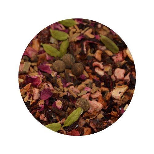 Hagebuttenschalen, Apfelstückchen, Hibiskusblüten, Hibiskus geschnitten, Orangenschalenstückchen, Sonnenblumen, Mandeln, Zimt, Nelken und natürliches Aroma