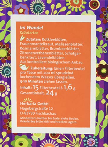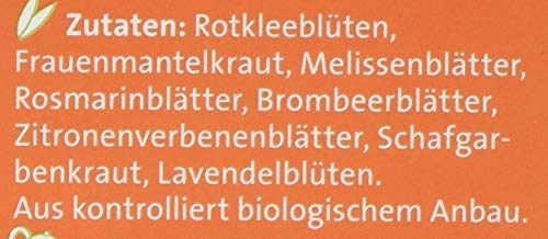 Zutaten:Rotkleeblüten, Frauenmantelkraut, Melissenblätter, Rosmarinblätter, fermentierte Brombeerblätter, Zitronenverbenenblätter, Schafgarbenkraut, Lavendelblüten. Nicht mehr da kontrolliert biologischem Landbau.