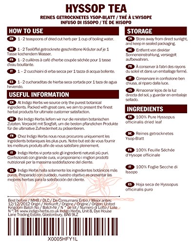 Das ungarische Ysop-Blatt woraus sich der Ysop-Blatt-Tee von Indigo Herbs zusammensetzt, ist eine mehrjährige Pflanze, die von Frühling bis Herbst blüht und speziell zugunsten den Gebrauch wie Tee angebaut wird. Die Blätter werden gepflückt und entfernt von direkter Sonneneinstrahlung getrocknet, um sicherzustellen, dass sämtliche chemischen Bestandteile im Blattmaterial erlangen bleiben. Nach dem Abtrocknen werden die Blätter überprüft und auf Schadstoffe getestet, so daß daher die besten und reinsten Blüten in diesem Ysop-Tee enthalten sind. Dieser gesamte Handlung erfüllt GMP-Standards und ist von Indigo Herbs qualitätsgesichert