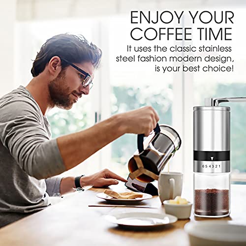 6 Verstellbares Mahlstufen: Mit der Kaffeemuehle Hand dank des einstellbaren 6 Mahlgrad. Geeignet für Türkischen Kaffee, Espresso, Filterkaffee, French Press Kaffee und Cold Brew Kaffee. Der Mahlgrad kann nach eigenen Wünschen eingestellt werden,Wir empfehlen Mahlgrad 1-2 für Espresso, 2-3 für Mokka, 3-4 für Filterkaffee, 4-5 für die French Press und 5-6 für Cold Brew Coffee.