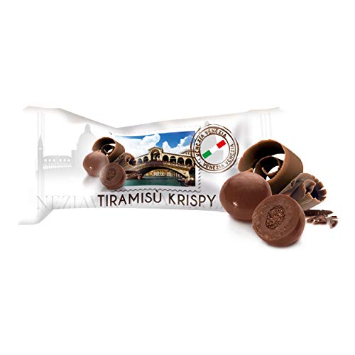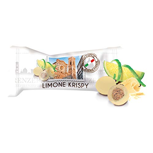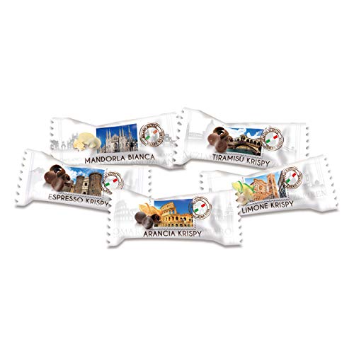 Zutaten: Limone-Krispy – Zutaten: Weiße Schokolade 96% (Zucker, Kakaobutter 29%, VollMILCHpulver, Molkenpulver (MILCH), MagerMILCHpulver, Emulgator: SOJAlecithin (E322); Aromen), extrudiertes Getreide 4% (Reismehl, Zucker, Magerkakaopulver 5%, Sonnenblumenöl), Überzugsmittel: Gummi arabicum (E414), Schellack (E904). Kakao: 29% mindestens. – Tiramisu-Krispy – Zutaten: Zutaten: Weiße Schokolade 47,5% (Zucker, Kakaobutter 29%, VollMILCHpulver, Molkenpulver (MILCH), MagerMILCHpulver, Emulgator: SOJAlecithin (E322); Aromen), Milchschokolade 47,5% (Zucker, Kakaobutter 25,5%, VollMILCHpulver,Kakaomasse 7,5%, MagerMILCHpulver, Emulgator: SOJAlecithin (E322); Aromen), extrudiertes Getreide 3% (Reismehl, Zucker, Magerkakaopulver 5%, Sonnenblumenöl), Kaffeepaste 1,4% (Arabica Kaffeekonzentrat 47%, Zucker, Glukose, Palmfett, Emulgator: SOJAlecithin (E322)), Überzugsmittel: Gummi arabicum (E414), Schellack (E904); Aromen. Kakao: 32% mindestens. – Espresso-Krispy – Zutaten: Dunkle Schokolade 92% (Kakaomasse 50%, Zucker, Kakaobutter 5%, Emulgator: SOJAlecithin (E322); Aromen), extrudiertes Getreide 5% (Reismehl, Zucker, Magerkakaopulver 5%, Sonnenblumenöl), Kakaobutter, Kaffeepulver 1%, Überzugsmittel: Gummi arabicum (E414), Schellack (E904). Kakao: 55% mindestens. – Arancia-Krispy – Zutaten: Dunkle Schokolade 96% (Kakaomasse 50%, Zucker, Kakaobutter 5%, Emulgator: SOJAlecithin (E322); Aromen), extrudiertes Getreide 4% (Reismehl, Zucker, Magerkakaopulver 5%, Sonnenblumenöl), Überzugsmittel: Gummi arabicum (E414), Schellack (E904). Kakao: 55% mindestens. – Mandorla Bianca – Zutaten: Weiße Schokolade 62% (Zucker, Kakaobutter 29%, VollMILCHpulver, Molkenpulver (MILCH), MagerMILCHpulver, Emulgator: SOJAlecithin (E322); Aromastoffe), geröstete MANDELN 36%, Überzugsmittel: Gummi arabicum (E414), Schellack (E904). Kakao: 29% mindestens.