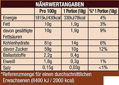 Zutaten: Zucker (54%), Glukosesirup, Kokosfett (aufgebraucht gehärtet), löslicher Bohnenkaffee (8%), Stabilisatoren (E340, E452), MILCHEIWEISS, Emulgatoren (E471, E481), Trennmittel (E551).